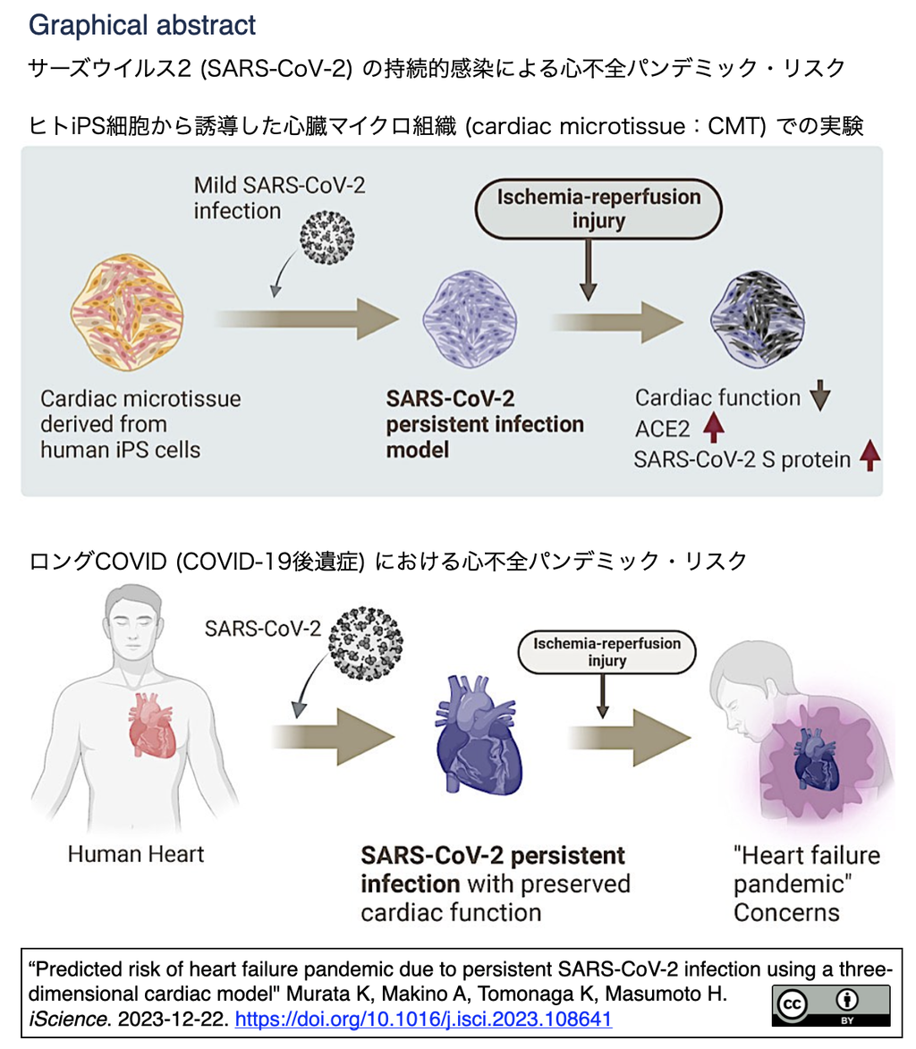 ヒトiPS細胞由来の心臓マイクロ組織 (cardiac microtissues: CMT) [*]を用いて、サーズウイルス2持続感染モデルを作成し、心不全パンデミックが発生するリスクを検証した [グラフィカルアブストラクト引用右図参照] 。- 軽度の感染では、1ヶ月間有意な機能障害を起こすことなくウイルスの存在を維持し、持続感染を示した。