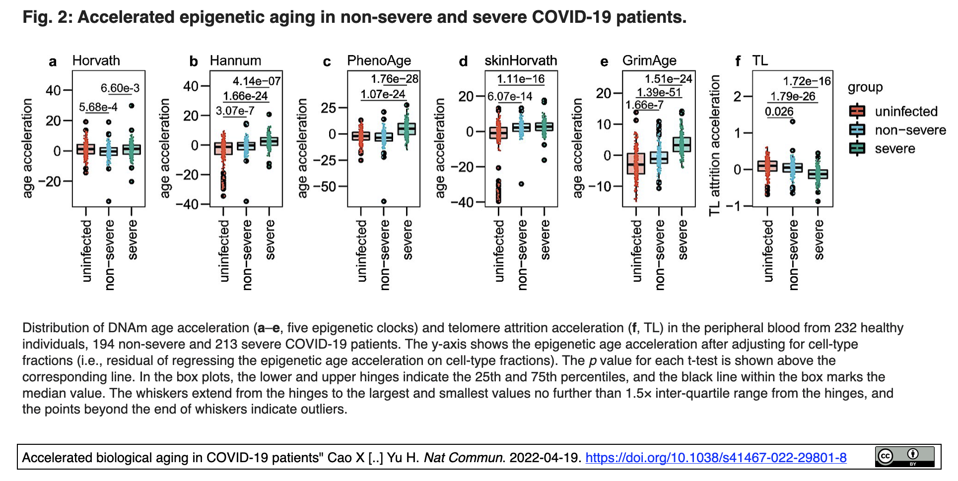 [出典] "Accelerated biological aging in COVID-19 patients" Cao X [..] Yu H. Nat Commun. 2022-04-19. https://doi.org/10.1038/s41467-022-29801-8 [所属] Guizhou Provincial People’s Hospital, Sun Yat-sen U, Thermo Fisher Scientific Inc, U Arizona, Chongqing Medical U, Josep Carreras Leukaemia Research Institute, Bellvitge Biomedical Research Institute, Center for Biomedical Research on Rare Diseases, Institucio Catalana de Recerca i Estudis Avancats, Centro de Investigación Biomédica en Red de Cancer, U Barcelona.