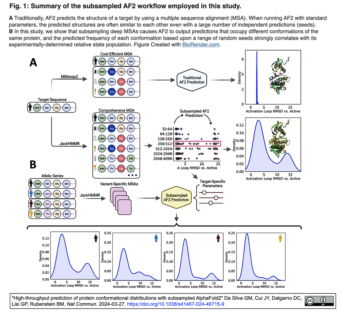 AF2は、大量の実験データを用いて学習され、膨大なメタゲノム・データベースからの共進化情報を組み込まれ、ディープニューラルネットワークを使用して、アミノ酸配列から基底状態のタンパク質構造を高精度で予測する。しかし、AF2を対象とする一連の研究から、デフォルトのAF2アルゴリズムは、タンパク質が取りうる多様なコンフォーメーションや配列変異の影響を予測する能力には限界があることが明らかにされてきた。フォールドスイッチング [fold switching: Structure 2021]や秩序-無秩序転移のような、異なるコンフォーメーションが関与する現象は、プロテオーム全体に遍在しており、多くの高分子の活性に直接結びついていることから、基底状態とは異なるコンフォーメーションを予測するツールは、基底状態を正確に予測する能力と同じくらい革命的である。