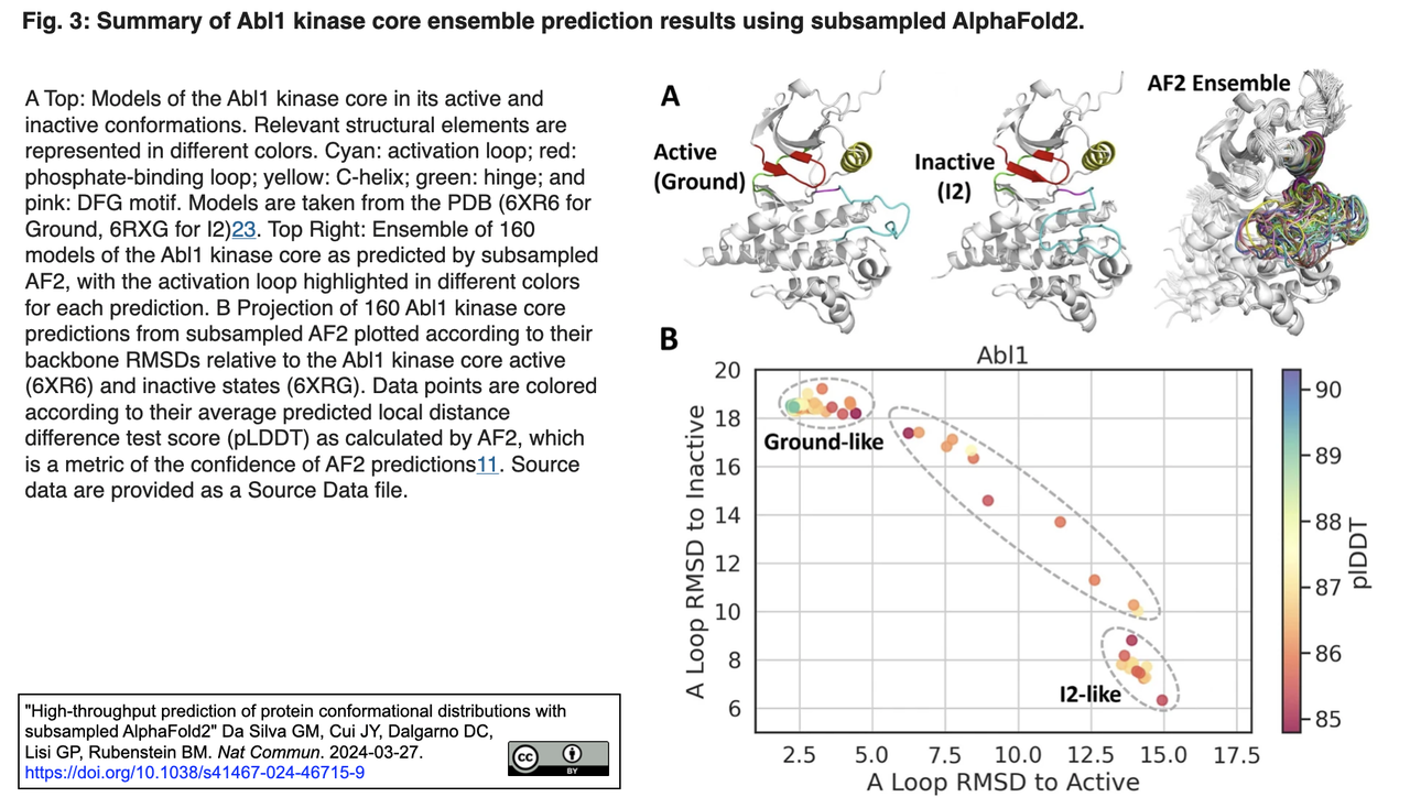 こうして、複数の配列アラインメントをサブサンプリングすることでタンパク質のコンフォーメーションのアンサンブルを生成する方法を考案し [Fig. 1引用右図参照]、Abl1チロシンキナーゼコアと顆粒球マクロファージコロニー刺激因子(GM-CSF)のコンフォーメーション分布における配列に起因する違いを予測するAF2の能力を系統的にテストした。Abl1とGM-CSFは、利用可能な配列データの量が大きく異なることから、選択した。これまでの研究とは異なり、最初の例として、SrcキナーゼからAbl1への進化系統における活性状態集団の変化を検出することに焦点を当て、状態分布を変化させることが知られている、あるいは疑われている一点変異や二点変異の影響を予測する能力をテストした。