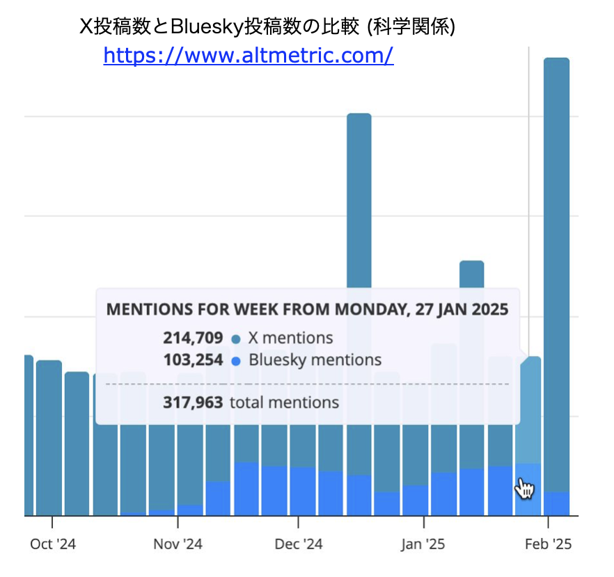 また、Bluesky投稿数とX投稿数の比較グラフもBlueskyに投稿し、Bluesky立ち上げ期にはXの4分の1程度であったのが、最近では、ほぼ50%に達する日もでるようになってきた [右図参照]と、している。2024-11-28 Nature誌のニュース記事に準拠した初稿