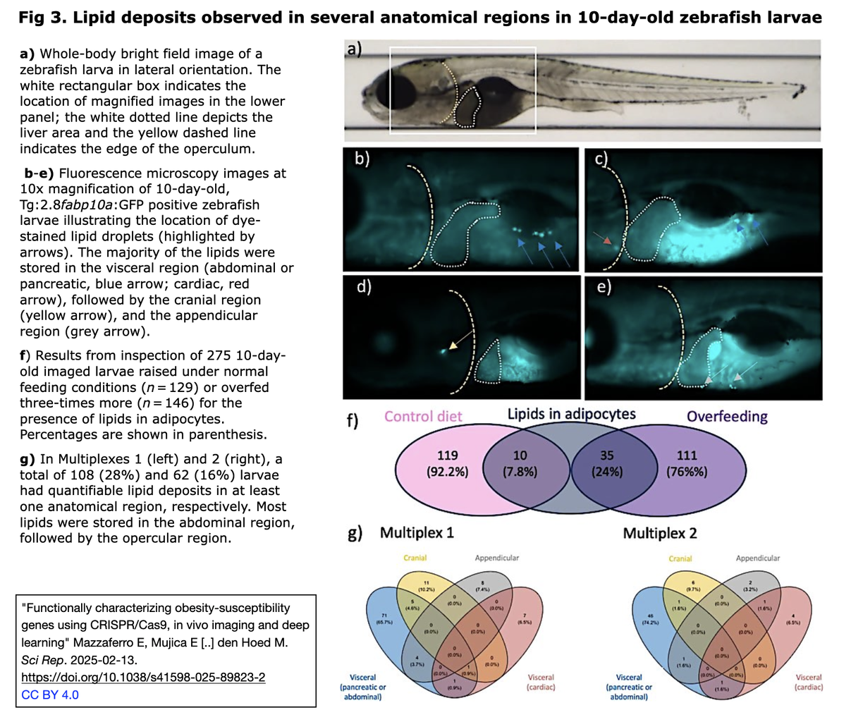 食餌介入の結果、受精後(days post-fertilization: dpf)10日(n = 275)までに脂肪細胞への脂質蓄積の確率を高めるには、5日間の過食で十分であることが示された [Fig. 3引用右図参照]。しかしながら、その後の実験から、CRISPR/Cas9による12〜16種類の肥満遺伝子は、10dpfでは脂肪細胞への脂質蓄積に影響を示さず(n = 1014)、また、8dpfにおける摂食量への影響(n = 1127)は、哺乳類から得られた以前の結果と矛盾していた。 一方で、CRISPR/Cas9誘導変異が、血管系(sh2b1 およびsim1b )および肝臓(bdnf )における脂質の異所性蓄積をもたらし、また、サイズ(pcsk1, pomca, irs1)、全身のLDLcそして/または総コレステロール含量(irs2b およびsh2b1)、膵臓β細胞の形質そして/またはグルコース含量(pcsk1, pomca, sim1a )に影響を及ぼすことが、観察された。