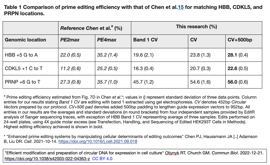 事実、プライム編集(PE)におけるガイドRNA(pegRNA)を発現させた CVを適用し、直鎖状プラスミドで発現させたガイド [*]と比較して、この方法が同等、あるいはそれ以上の性能を持つことを実証した [オリジナル論文Table 1引用右図参照]。[*]