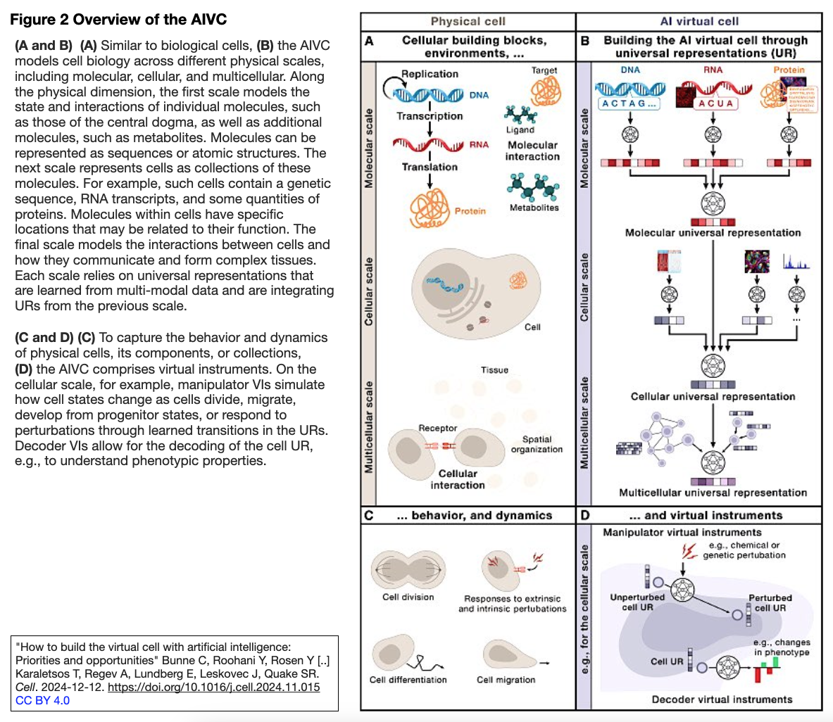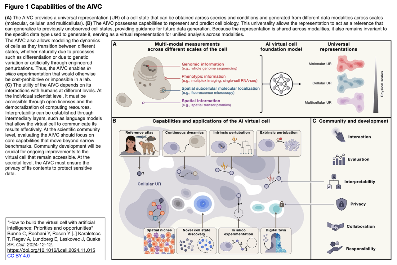 [出典] Perspective "How to build the virtual cell with artificial intelligence: Priorities and opportunities" Bunne C, Roohani Y, Rosen Y [..] Karaletsos T, Regev A, Lundberg E, Leskovec J, Quake SR. Cell. 2024-12-12. https://doi.org/10.1016/j.cell.2024.11.015 [所属機関は49; 共同責任著者3名はいずれもChan Zuckerberg Initiative (Redwood City)に籍がある;参考文献154件を含む19ページ].