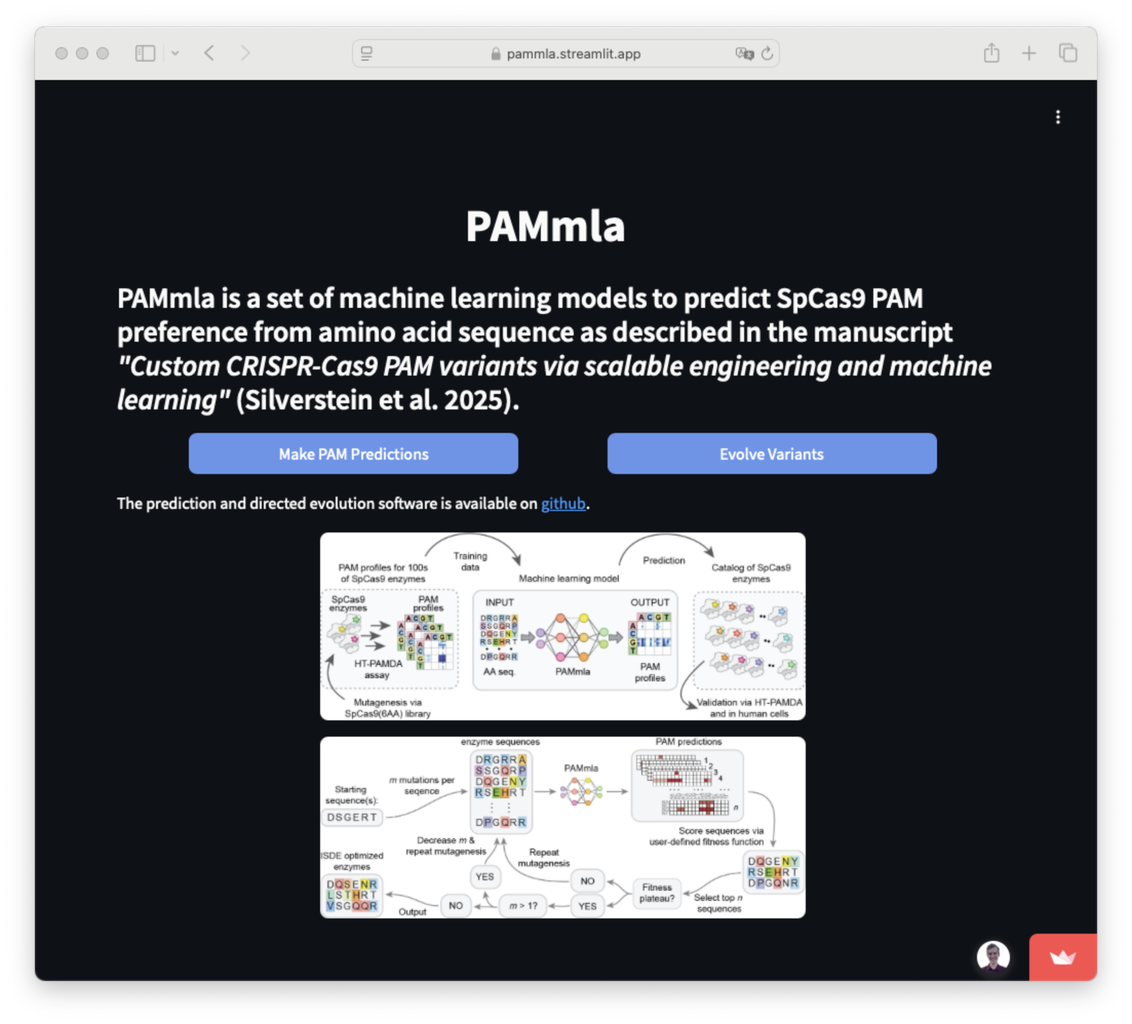 HMSのLuca Pinello研究室と協力して、新規Cas9をリアルタイムで予測・操作できるウェブサイト [https://pammla.streamlit.app/] を構築した [右図スクリーンキャプチャ参照]
