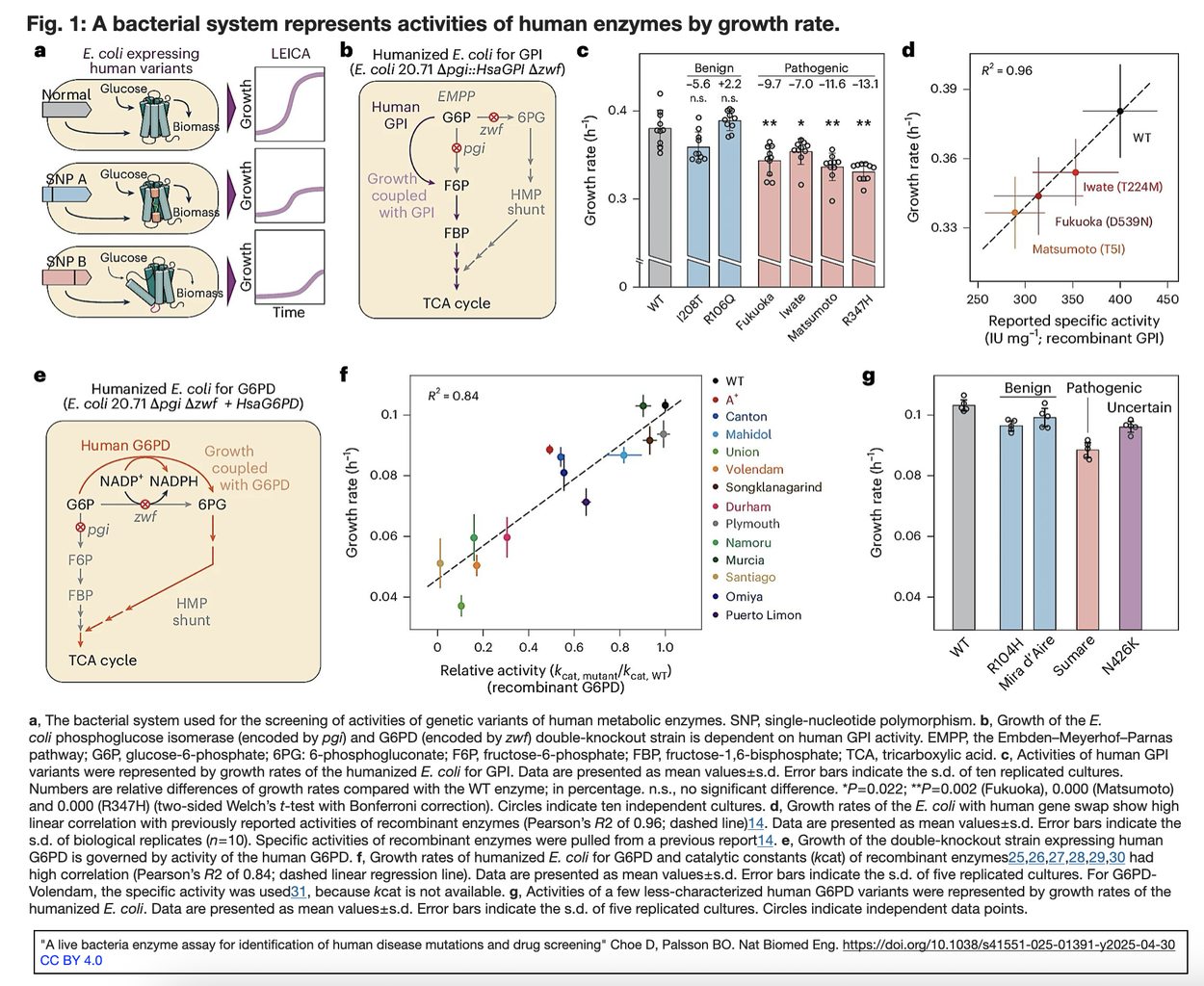 大腸菌の増殖速度は、解糖フラックスに依存するため、異種発現したヒト酵素の活性の代替指標として機能する。大腸菌の遺伝子操作の容易さから、これらの酵素におけるヒト変異は問題なく再現され、異なる変異体を持つ大腸菌株はそれぞれ異なる増殖速度を示し、変異によって誘発される酵素活性の変動を反映することが確認された。ここで重要なことは、増殖速度が、組み換えタンパク質アッセイで測定した酵素活性と高い線形相関を示したことである。