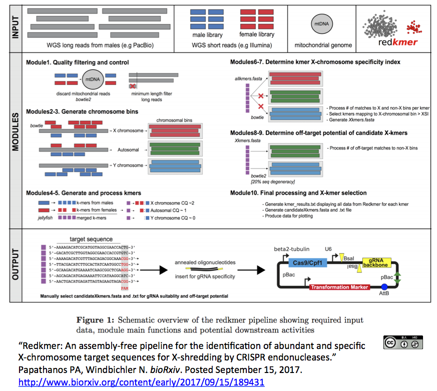 - [出典] “Redkmer: An assembly-free pipeline for the identification of abundant and specific X-chromosome target sequences for X-shredding by CRISPR endonucleases.” Papathanos PA, Windbichler N. bioRxiv. Posted September 15, 2017. > CRISPR J 2018-02-01