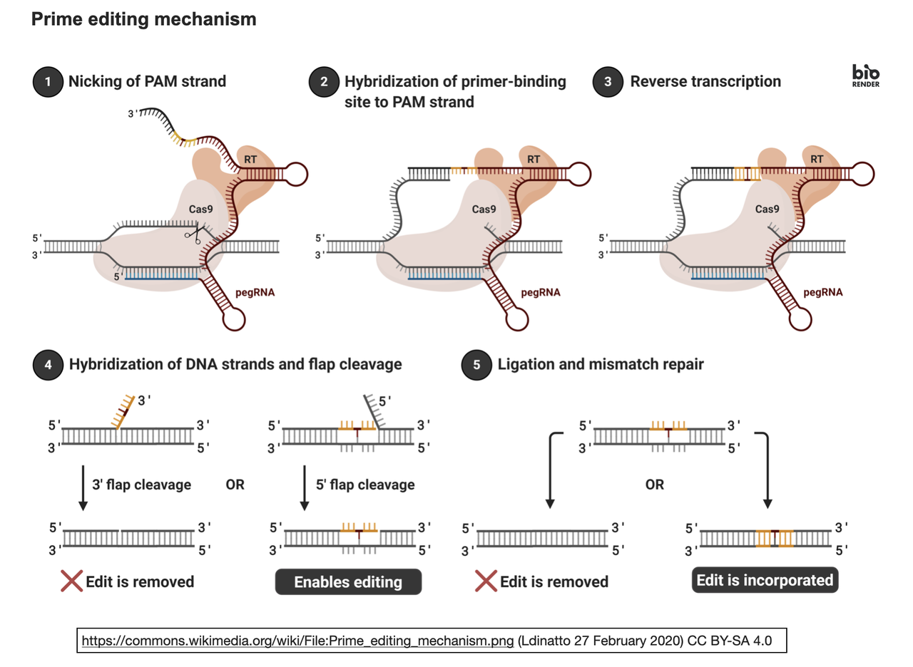 (pegRNA) で構成されている [右図モデル図参照]。この投稿記事の冒頭にあるように、ニックの入った 3′ DNA 末端は、「挿入すべき配列」をコードしている pegRNA テンプレートにアニールするために解放され、逆転写酵素がプライミングされてテンプレート配列を 3′ DNA 末端の延長部分に書き込む。この編集された新しい 3′ 鎖は、競合する 5′ 鎖を置き換えて、意図した編集が実現する。このプロセスを経て、PEは、置換、挿入、欠失など、さまざまな編集タイプに適応できる。