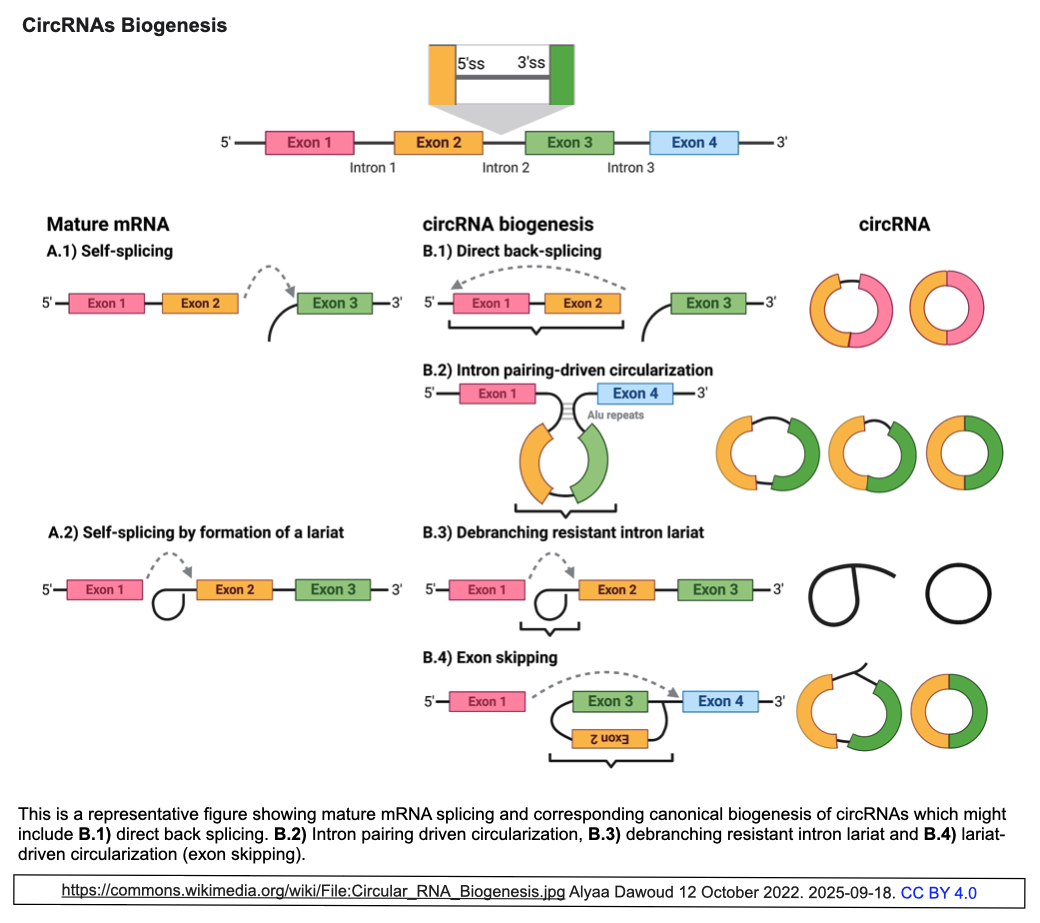 環状RNAは、直鎖状エクソンのバックスプライシング(BSJ)によって形成されるRNA分子であり、これまでに数千種類が同定されている。[右図はWikipediaから引用した環状RNA生成機構のモデル図]。しかし、その発現レベルが比較的低いことと、何よりも環状RNAが由来するゲノム領域から生成される直鎖状mRNAと配列がほぼ重複し両者の識別が困難なことから、機能が特定されている環状RNAはごく僅かである。 近年、環状RNAの機能解析のアプローチとして、従来のRNAiによるノックダウンに加えて、バックスプライシングによって形成される特定のジャンクションを直接に標的可能であり、ひいては、環状RNAアイソフォームの選択的分解を期待できるCRISPR-Cas13システム、特に比較的小型なCas13dによる解析の試みが広がりつつある [#1, 2]。これに対して、スタンフォード大学医学部遺伝学科に籍を置く研究者チームは今回、Cas13dによるアプローチも、直鎖mRNAに対するオフターゲット活性に起因する擾乱を回避できず、また、BSJに由来する接合部の設計に制約があることから、環状RNAのハイスループットかつ高信頼性な機能解析に展開するには限界があるとした。