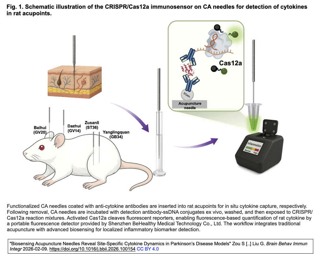 - "Biosensing Acupuncture Needles Reveal Site-Specific Cytokine Dynamics in Parkinson’s Disease Models" Zou S [..] Liu G. Brain Behav Immun Integr 2026-02-09. https://doi.org/10.1016/j.bbii.2026.100154 [所属] The Chinese University of Hong Kong (Integrated Devices and Intelligent Diagnosis (ID2) Laboratory)
