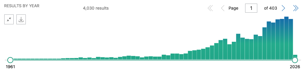 [注] PubMedを"acupuncture treatment" (鍼治療)の完全一致で検索すると, 1961年から2026年までの出版論文4,030件がヒットし, 2020年代に入って一段と増えたように見える [PubMed検索結果画面から引用した右図参照]。