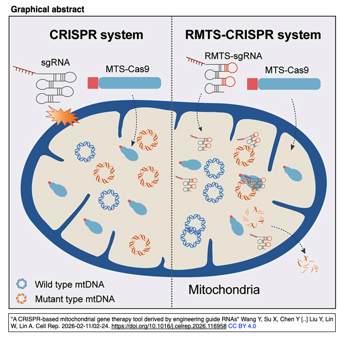 - "A CRISPR-based mitochondrial gene therapy tool derived by engineering guide RNAs" Wang Y, Su X, Chen Y [..] Liu Y, Lin W, Lin A. Cell Rep. 2026-02-11/02-24. https://doi.org/10.1016/j.celrep.2026.116958 [所属] Zhejiang University, Zhejiang University School of Medicine, Wenzhou Medical University