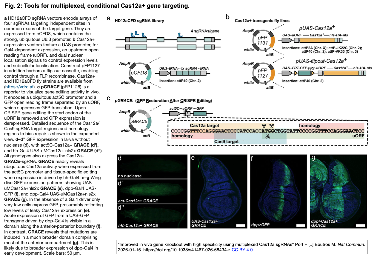 pGRACE (GFP Restoration After CRISPR Editing) を開発し [Fig. 2引用右図 c 参照]、2000種類以上のsgRNAと組み合わせることで、ショウジョウバエゲノムの33%にわたるCas12a活性を評価した。 その結果、多重化Cas12a sgRNAアレイの標的特異的活性が極めて高く(> 99%)、オフターゲット活性が極めて低く(<1%)なることが明らかになった。100以上の遺伝子を並行して標的とする既存のCas9ベースのシステムとの定量的な比較により、多重化Cas12a遺伝子ターゲティングは優れた性能を発揮し、従来の方法では見逃されていた表現型を明らかにすることが実証された。