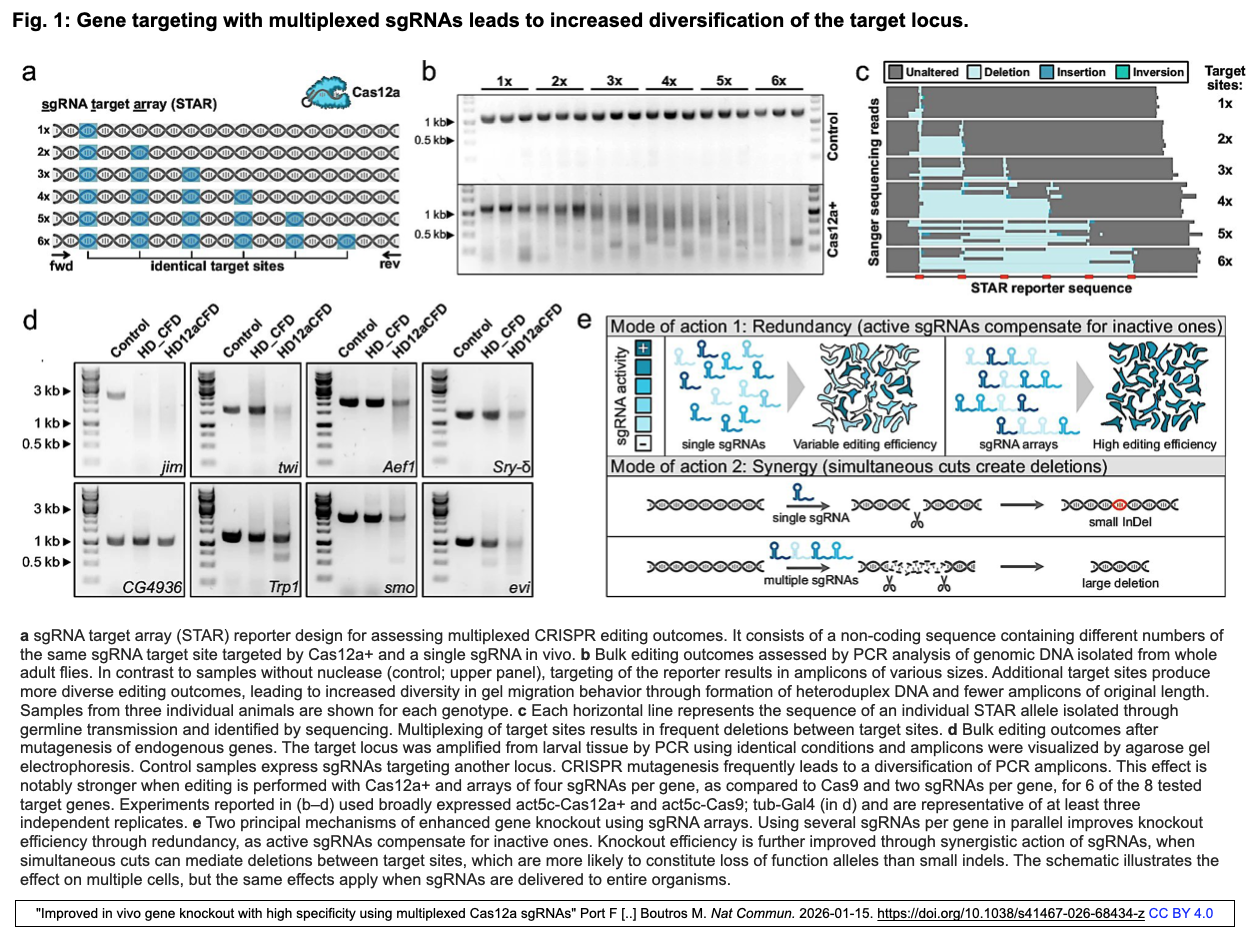 - "Improved in vivo gene knockout with high specificity using multiplexed Cas12a sgRNAs" Port F [..] Boutros M. Nat Commun. 2026-01-15. https://doi.org/10.1038/s41467-026-68434-z [所属] German Cancer Research Center Heidelberg (Division of Signaling and Functional Genomics) (ドイツ), Heidelberg University (Institute for Human Genetics, Dept Cell and Molecular Biology & BioQuant), Molecular Biosciences/Cancer Biology Program, University of Applied Sciences Bingen (Dept Life Sciences and Engineering), Hunan University (The Affiliated XiangTan Central Hospital of Hunan University) (兼) (中国)