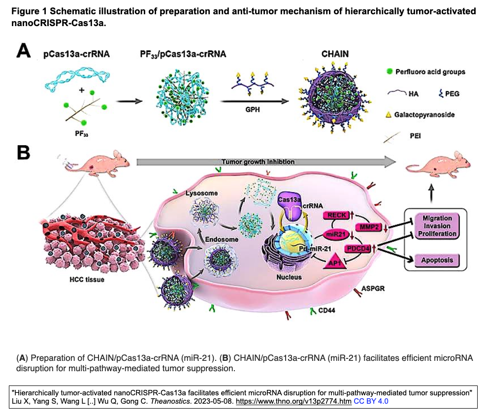 - "Hierarchically tumor-activated nanoCRISPR-Cas13a facilitates efficient microRNA disruption for multi-pathway-mediated tumor suppression" Liu X, Yang S, Wang L [..] Wu Q, Gong C. Theanostics. 2023-05-08. https://www.thno.org/v13p2774.htm