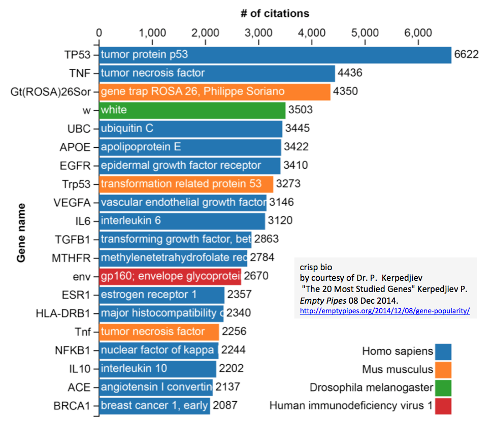 - 現在Harvard Medical Schoolにて、ゲノムデータの可視化を研究テーマにしているポストドクであるPeter Kerpedjievは、ソフトウエアエンジニアのバックグラウンドから遺伝学の集中コースに参加した際に「(コースで)知的会話をするに、予め知っておかなければならない遺伝子は何か」と思いを巡らした。そこで、論文数の観点からNCBIが提供している遺伝子データベースを解析し、結果を"The 20 Most Studied Genes"(第1位TP53から第20位BRCA1まで)としてEmpy Pipesのブログに投稿した(2014年;下図(by courtesy of Dr. P. Kerpedjie)参照)。