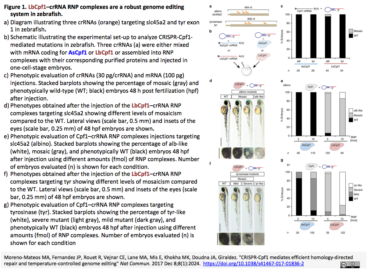 - Moreno-Mateos MA, Fernandez JP, Rouet R, Vejnar CE, Lane MA, Mis E, Khokha MK, Doudna JA, Giraldez. "CRISPR-Cpf1 mediates efficient homology-directed repair and temperature-controlled genome editing" Nat Commun. 2017 Dec 8;8(1):2024.