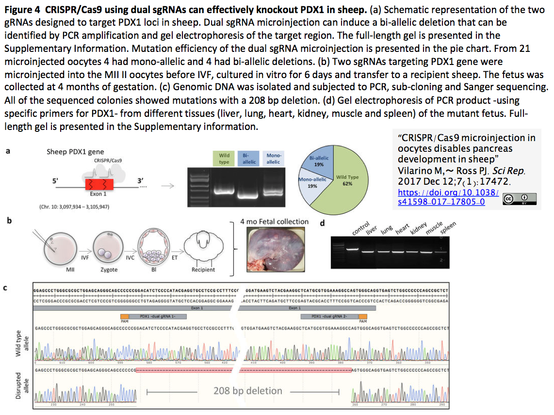 - [出典]"CRISPR/Cas9 microinjection in oocytes disables pancreas development in sheep" Vilarino M, Rashid ST, Suchy FP, McNabb BR, van der Meulen T, Fine EJ, Ahsan S, Mursaliyev N, Sebastiano V, Diab SS, Huising MO, Nakauchi H, Ross PJ. Sci Rep. 2017 Dec 12;7(1):17472.