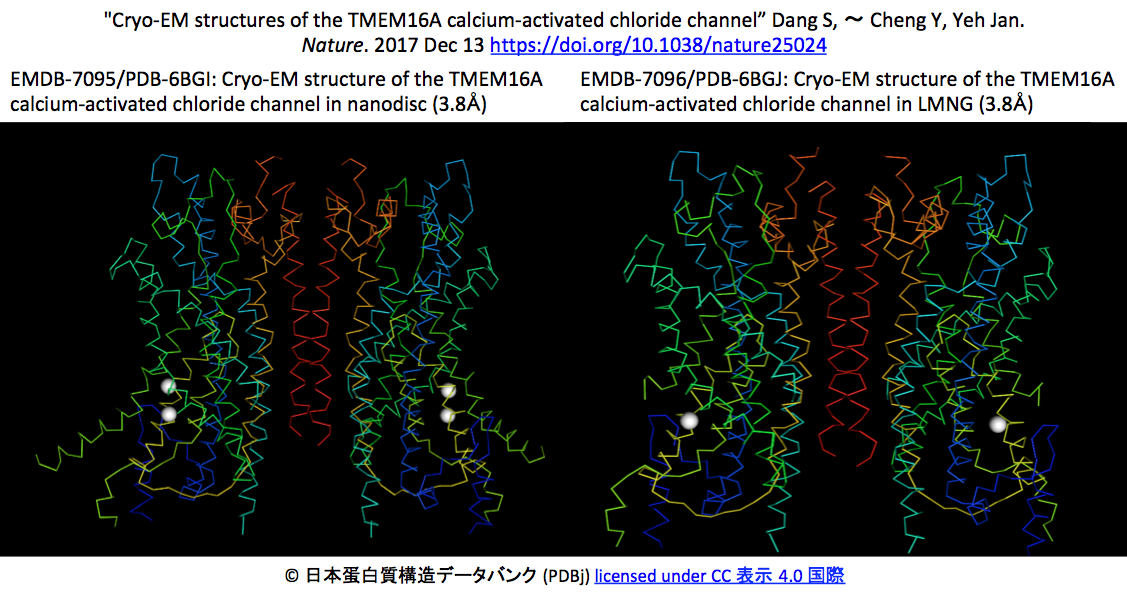 [出典5]"Cryo-EM structures of the TMEM16A calcium-activated chloride channel" Dang S, 〜 Cheng Y, Yeh Jan. Nature. 2017 Dec 13.EMD-7095/PDB-6BGI: Cryo-EM structure of the TMEM16A calcium-activated chloride channel in nanodisc (3.8Å)