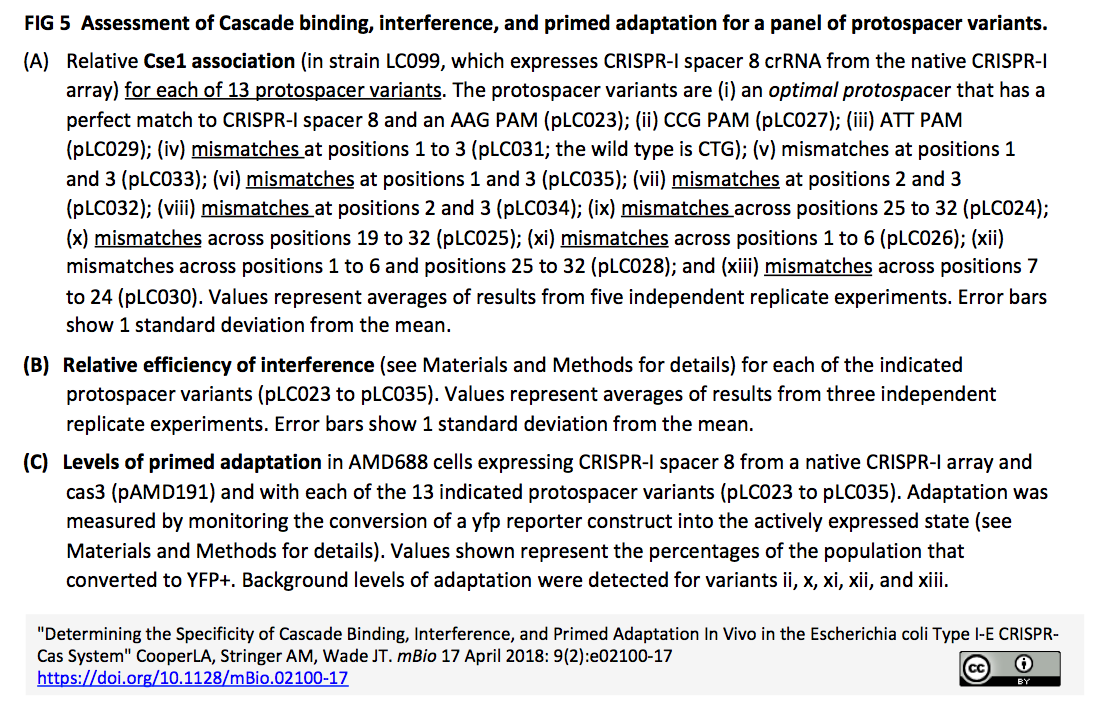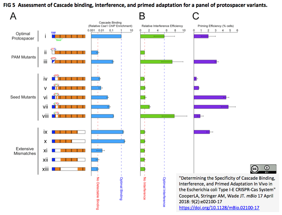 - [出典] "Determining the Specificity of Cascade Binding, Interference, and Primed Adaptation In Vivo in the Escherichia coli Type I-E CRISPR-Cas System" CooperLA, Stringer AM, Wade JT. mBio 17 April 2018: 9(2):e02100-17.