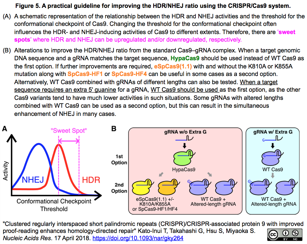 - Cas9の触媒活性ドメインが不活性状態から活性状態へとコンフォメーションを変化させるときに、gRNAと標的DNAの間のミスマッチが検証される (proof-reading)。gRNAの改変そしてまたはCas9変異体の利用などに拠って、このチェックポイントの閾値を調節することでHDRとNHEJの比率の最適化が可能になる(上図左Aのグラフを参照)。