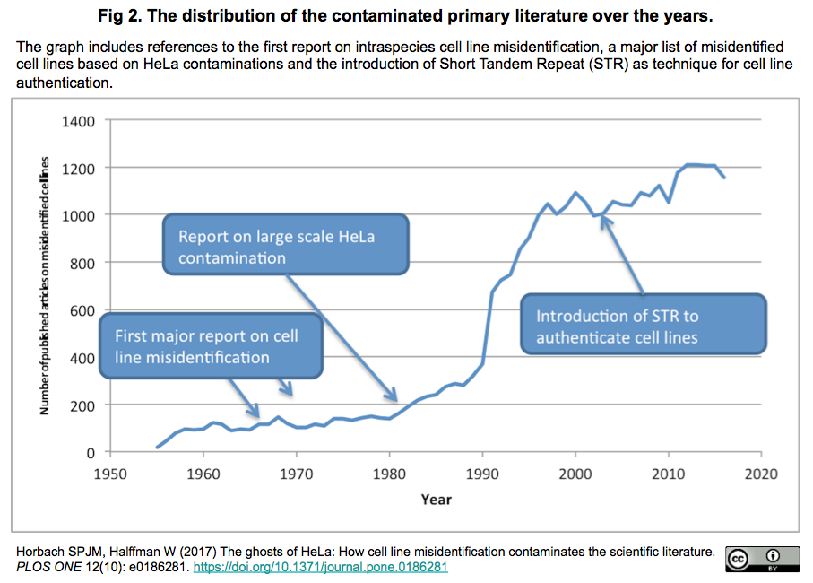 - HeLa 細胞のクロスコンタミネーションの問題が1970年代から指摘され始め、流通する細胞株の品質管理を維持する対策が始まり、日本でも理化学研究所や医薬基盤研究所に公的細胞バンクが設立されるに至った。しかし、科学技術のあり方の研究を専門とするRadboud UniversityのHorbachとHalffmanは、誤同定細胞株に基づいて論文数が、近年も、増え続けていたことを明らかにした。