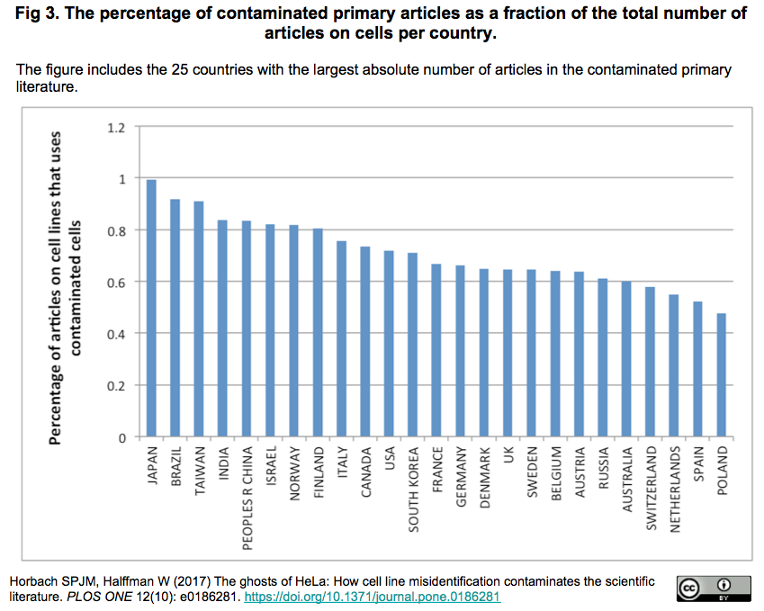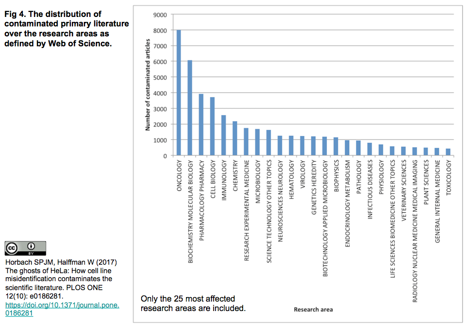 - [出典] "The ghosts of HeLa: How cell line misidentification contaminates the scientific literature" Horbach SPJM, Halffman W. PLoS One. 2017 Oct 12;12(10):e0186281.